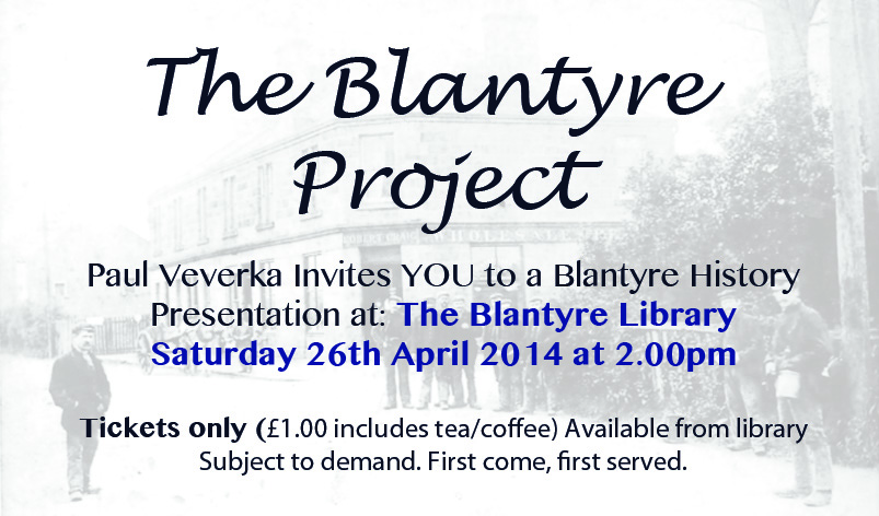 It’s always nice to be asked back, so i was absolutely thrilled when Blantyre Library asked if i would present another local history presentation after Easter. Things are now confirmed for 2pm on Saturday 26th April 2014 at the Blantyre library. Tickets are available from there only and limited due to limits on seating space. They cost £1 which the library need to charge to cover the teas and coffees. My services are free of charge as always.